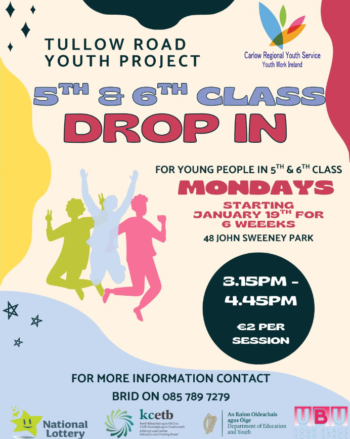 Tullow Road Youth Project Drop In is starting on Monday 19th January from 3.15pm – 4.45pm at 48 John Sweeney House, Tullow Road.