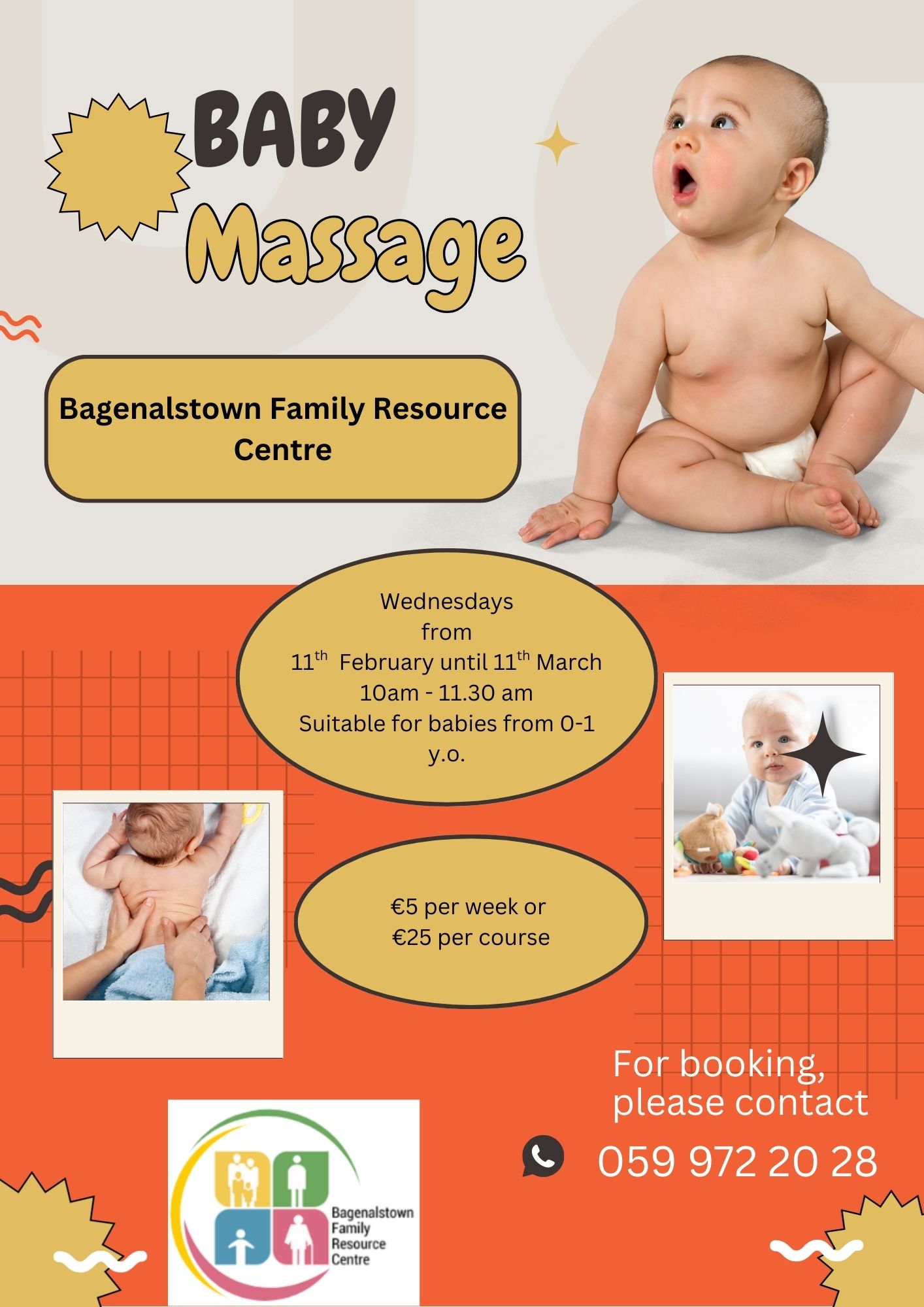 Bagenalstown Family Resource Centre is running a 5 week baby massage course from Wednesday 11th February – Wednesday 11th March. The series of classes teach parents easy, soothing techniques to support bonding, relaxation with their baby.