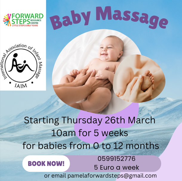 Forward Steps Family Resource Centre are running their very popular baby massage classes from the end of March. Contact Pamela to book your place and avoid disappointment!