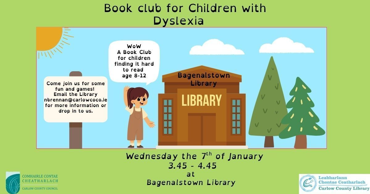 Bagenalstown Library host a book club for children with dyslexia on the first Wednesday of every month between 3.45pm – 4.45pm. The book club runs during school term time, contact Bagenalstown Library for further details.