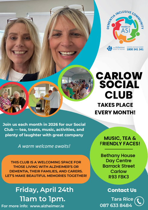 The Alzheimer’s Society of Ireland are hosting their monthly Carlow Social Club, a welcoming and supportive space for people living with dementia, along with their families and carers.