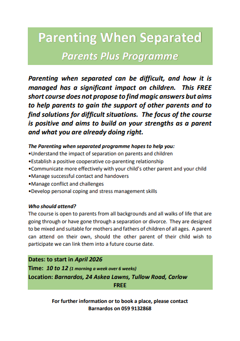 Parenting When Separated ProgrammeEvent Information 01-04-2026 31-05-2026 10:00 am 24 Askea Lawns, Tullow Road, CarlowEvent Contact Details 059 913 2868 Parenting When Separated Programme