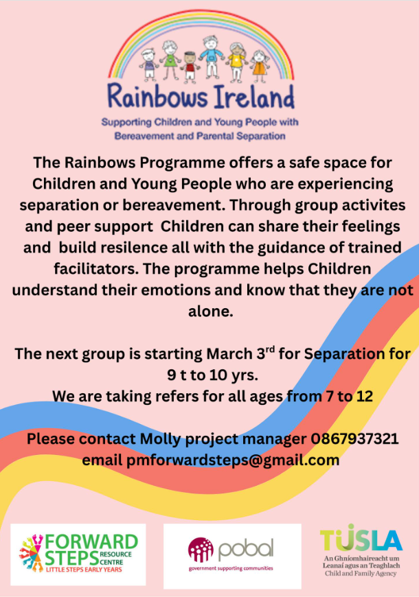 Forward Steps Family Resource Centre, Tullow are taking referrals for the next Rainbow Programme. This programme is aimed at children from the ages of 9 – 10 years who have experienced separation and it will run from the 3rd March.