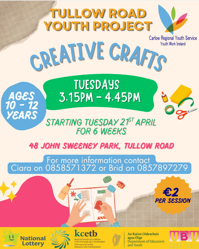 Tullow Road Youth Project – Creative CraftEvent Information 21-04-2026 26-05-2026 3:15 pm 48 John Sweeney House, Tullow Road, CarlowEvent Contact DetailsCiara or Brid Ciara on; 0858571372 or Brid on; 085789727 Tullow Road Youth Project – Creative Craft