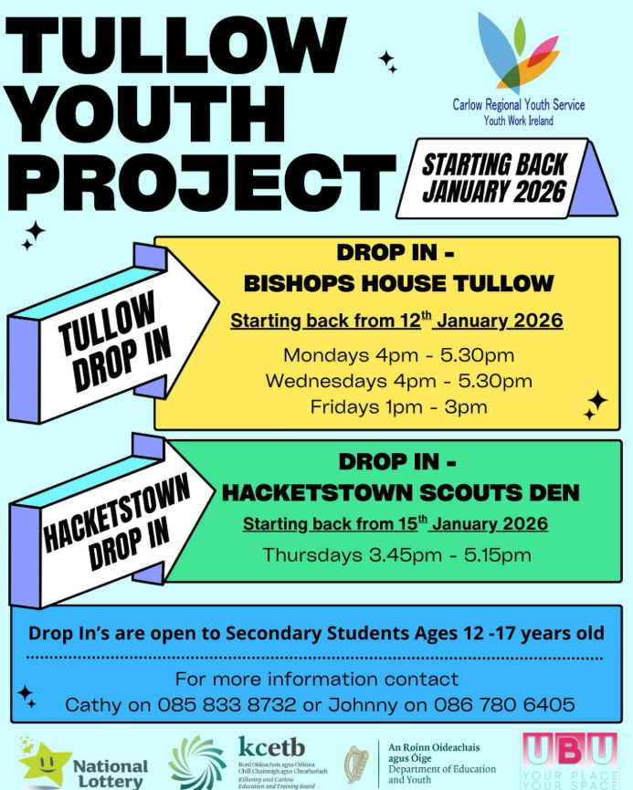 Youth Project Drop In – Tullow/HacketstownEvent Information 12-01-2026 14-12-2026 Bishops House Tullow / Hacketstown Scouts DenEvent Contact DetailsCathy or Johnny 085 833 8732 or 086 780 6405 Youth Project Drop In – Tullow/Hacketstown