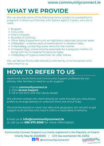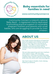 Community Connect is Ireland’s first national ‘Baby Bank’ – a registered charity dedicated to providing practical support to pregnant mothers and vulnerable families with small babies, who are struggling to provide for their children.