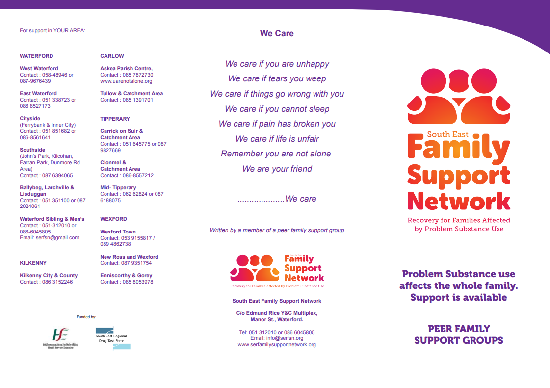 South East Family Support Network is a support service for families affected by problem substance use. South East Family Support Network is now an independent peer led organisation is managed by a voluntary management committee.