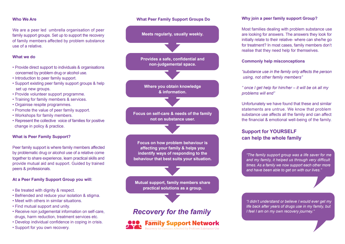 Peer family support is where family members affected by problematic drug & alcohol use of a relative come together to share experiences, learn practical skills and to provide mutual aid & support. Please find leaflet below;